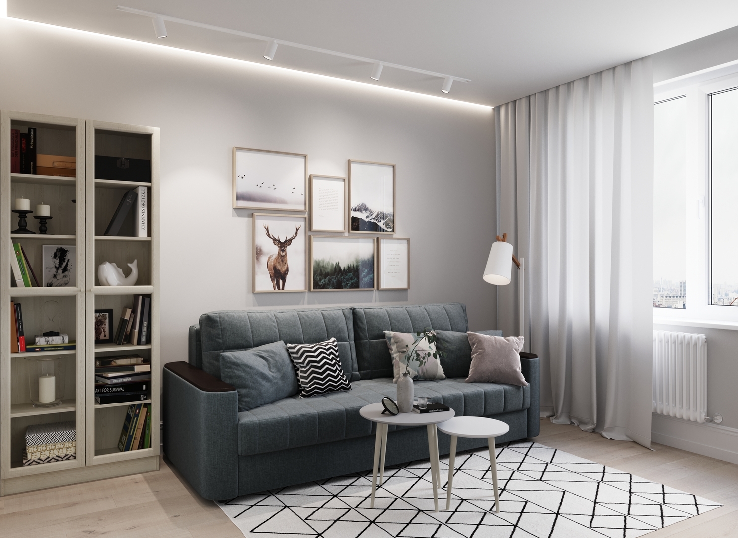 Спинка, выполненная в обивочной ткани, позволяет ставить диван в центре комнаты и зонировать пространство.