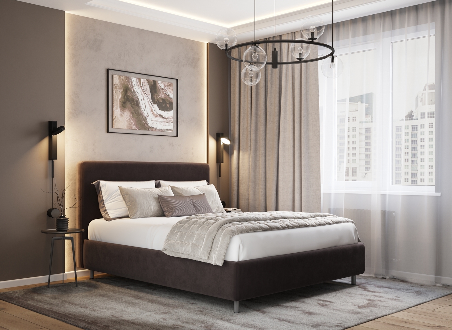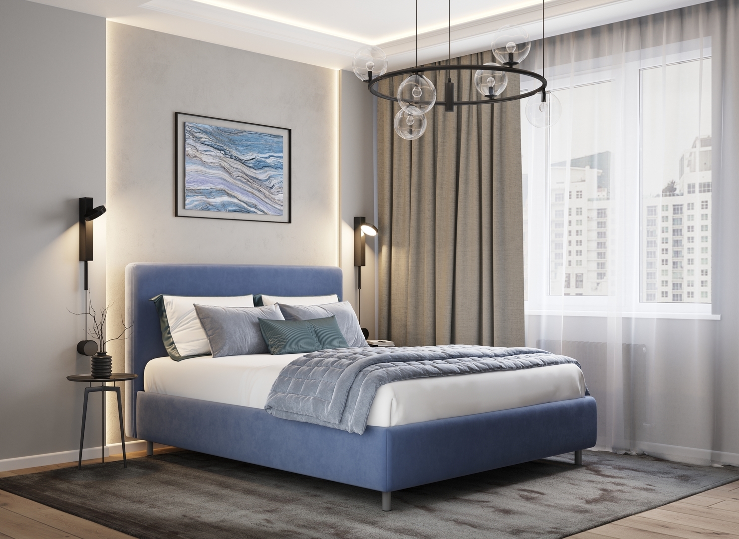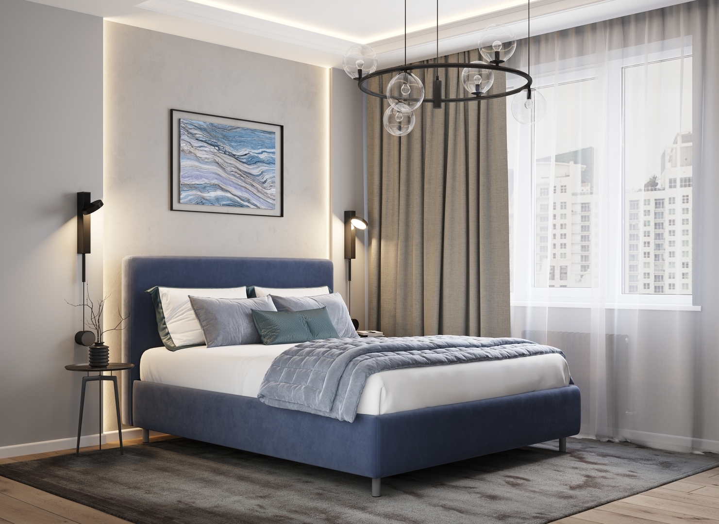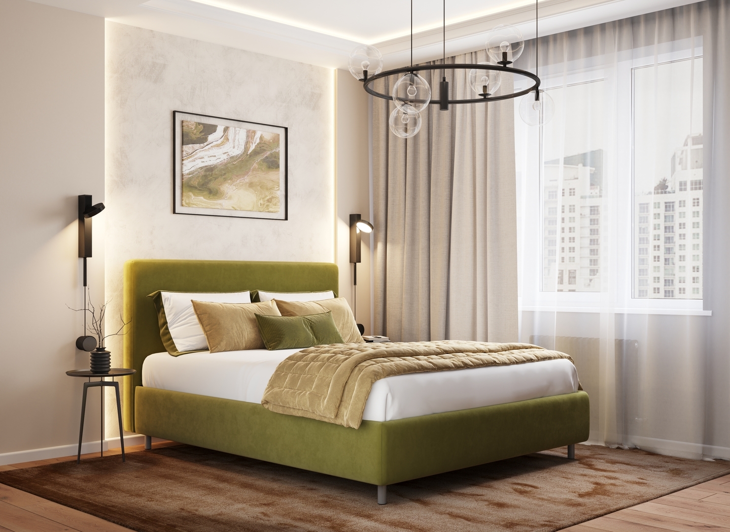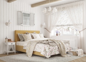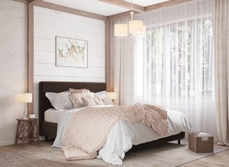 Творческий подход к выбору обивочного материала меняет образ дизайна. Велюр за счет своей бархатистой фактуры привносит в пространство шика и утонченности. Шенилл дополняет оформление спальни природными текстурами, создавая атмосферу тепла и уюта.