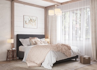 Обратная сторона изголовья выполнена в мебельной ткани и позволяет ставить кровать в центре комнаты для зонирования пространства.