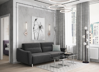 Механизм трансформации «Пантограф» подходит для ежедневного использования. Позволяет легко раскладывать и складывать диван, обеспечивая минимальный контакт дополнительных опор с напольным покрытием. Диван стоит на трапециевидных опорах, в то время как дополнительные остаются скрытыми, появляясь плавно и бесшумно в единственно нужный момент — при трансформации дивана в кровать.