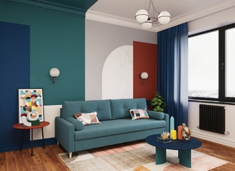 Спинка, выполненная в обивочной ткани, позволяет ставить диван в центре комнаты и зонировать пространство. По замыслу дизайнеров-конструкторов нижняя линия спинки дивана и подлокотники находятся на одном уровне. Уборка становится легкой, так как нет никаких препятствий для прохождения робота-пылесоса.