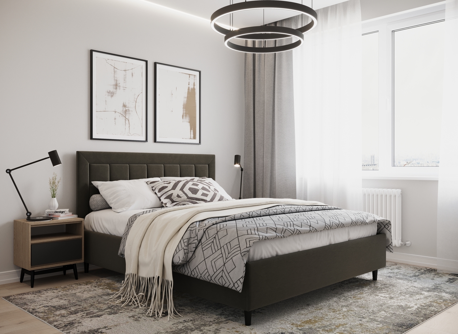 Стежка помещена в центр изголовья и обрамлена, словно картина. Объемные царги завершают цельную фигуру кровати и становятся гармоничным дополнением ее образа.