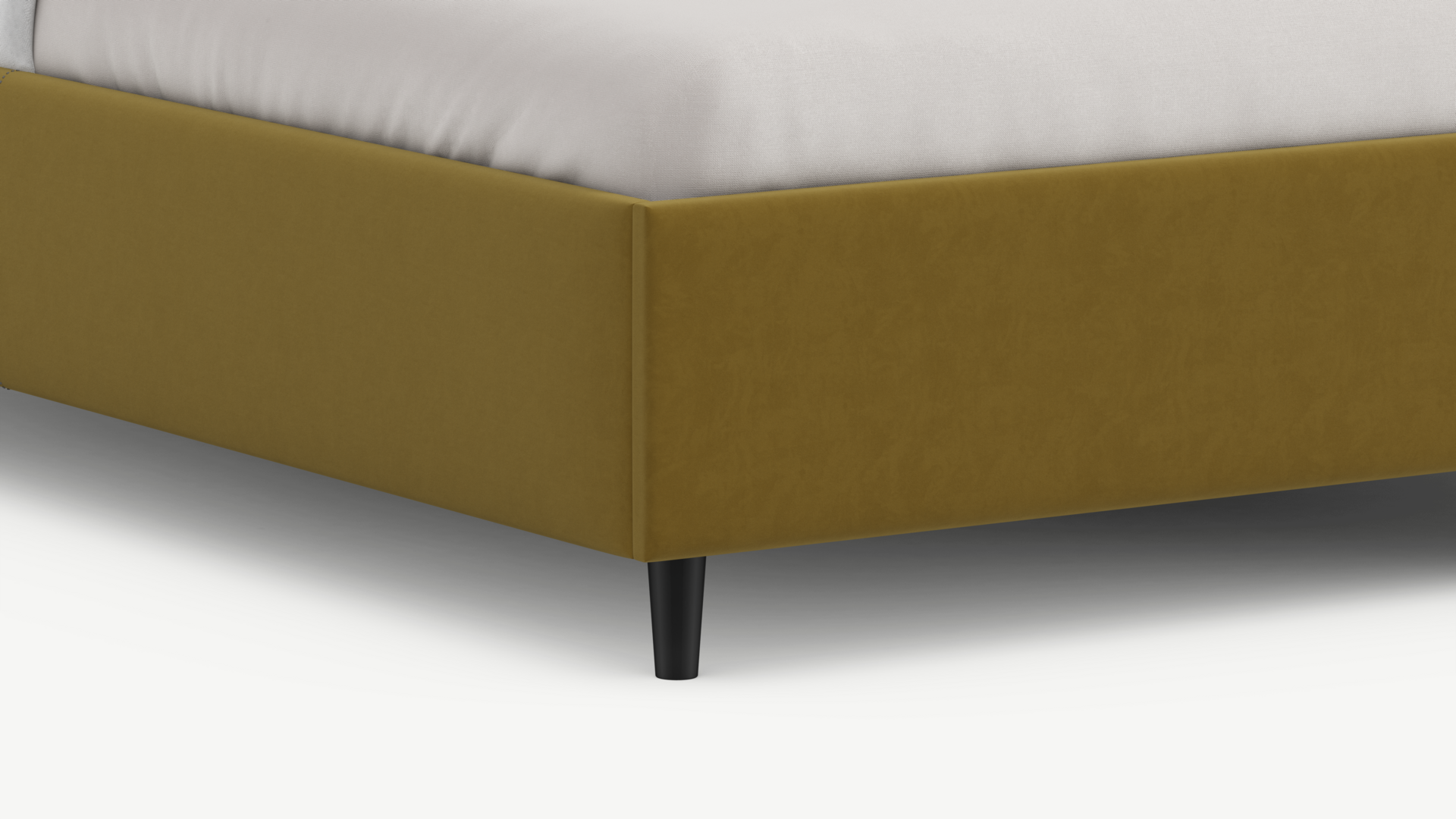 Царга, задающая пропорции, благодаря гладкости своей фактуры подчеркивает центральный элемент декора. Высокие опоры приподнимают фигуру кровати над полом и добавляют её образу визуальной легкости.